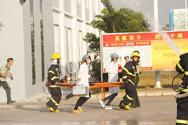 下午16:00點(diǎn)整,一聲急促的警報(bào)拉開了此次演練活動(dòng)的帷幕。“火情”從辦公大樓三層某辦公室起火,火勢(shì)燃燒猛烈并迅速向四周蔓延,情況危急。中國(guó)電子北海產(chǎn)業(yè)園立即啟動(dòng)《滅火應(yīng)急疏散預(yù)案》,滅火救援行動(dòng)組、現(xiàn)場(chǎng)警戒組、技術(shù)保障組、疏散引導(dǎo)組、通訊聯(lián)絡(luò)組、醫(yī)療救護(hù)組立即投入各自崗位,組織疏散樓內(nèi)人員,利用室內(nèi)消火栓進(jìn)行滅火,并隨即撥打119報(bào)警。員工紛紛拿起了自備的濕毛巾,捂著口鼻,沿著廠房疏散通道迅速有序的離開“火災(zāi)現(xiàn)場(chǎng)”到達(dá)安全地帶。5分鐘后,北海市消防支隊(duì)特勤中隊(duì)消防官兵到達(dá)現(xiàn)場(chǎng),經(jīng)偵查,發(fā)現(xiàn)火勢(shì)起火點(diǎn)在三樓的展廳并且燃燒猛烈,大量煙霧竄至樓外,有人員被困樓頂。指揮員立即匯報(bào)并下達(dá)搜救命令。搜救小組由大樓正門進(jìn)入,從三樓至一樓進(jìn)行搜救,利用擔(dān)架將受傷員工轉(zhuǎn)移到救護(hù)車上。救援小組利用云梯車將被困樓頂?shù)膯T工成功營(yíng)救到地面。在消防隊(duì)員的強(qiáng)攻下,火勢(shì)及時(shí)得到控制。整個(gè)演練過程指揮得當(dāng)、操作規(guī)范、緊張有序。